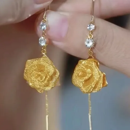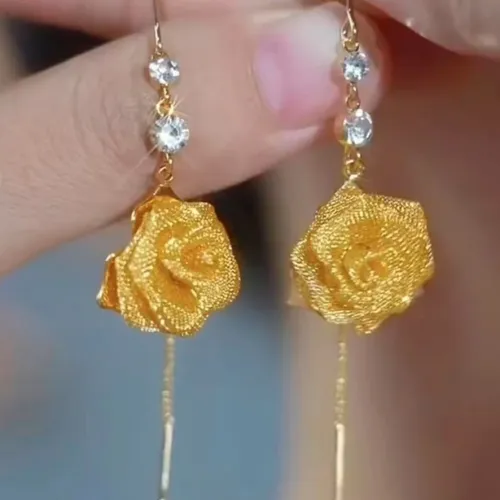 Long ear wire earrings made of copper alloy, featuring a niche, retro and three-dimensional yellow rose design. They are stylish with a French charm and extremely versatile.